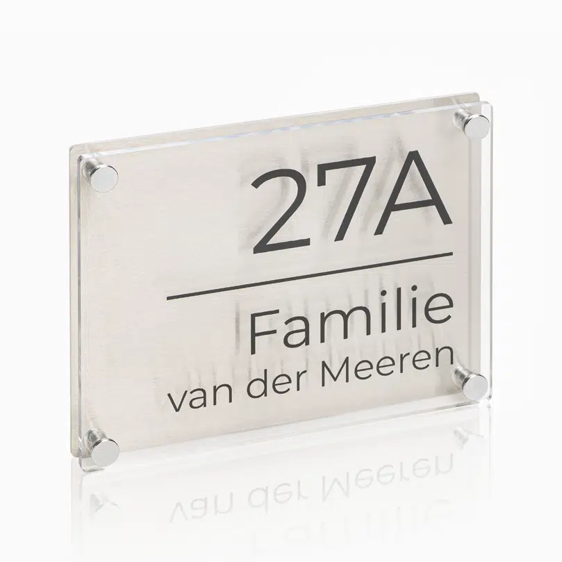 De combinatie van materialen zorgt voor een unieke uitstraling die je niet snel ergens anders vindt. Het RVS geeft het bordje een luxe, tijdloos karakter, terwijl plexiglas zorgt voor kleur en diepte. Samen vormen ze een bord dat zowel modern als duurzaam is. Bovendien is dit type bord onderhoudsvriendelijk en bestand tegen alle weersomstandigheden.
